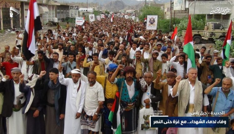 احتشد أبناء محافظة الحديدة، عصر اليوم في ٢٨ ساحة بمركز ومديريات المحافظة، دعما لفلسطين، تحت شعار “وفاء لدماء الشهداء.. مع غزة حتى النصر”.