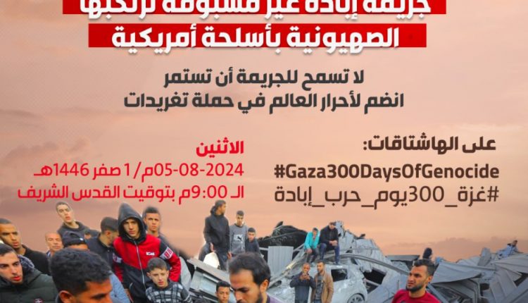 ودعا المنظمون إلى المشاركة الواسعة في حملة التغريدات لإبراز جرائم الإبادة الجماعية التي يرتكبها #العدو_الصهيوني، بدعم أمريكي، وأوروبي منذ 300 يوم، حيث تعيش غزة أكبر مذبحة في القرن، جريمة إبادة غير مسبوقة ترتكبها الصهيونية بأسلحة أمريكية وذلك على الهاشتاقات: