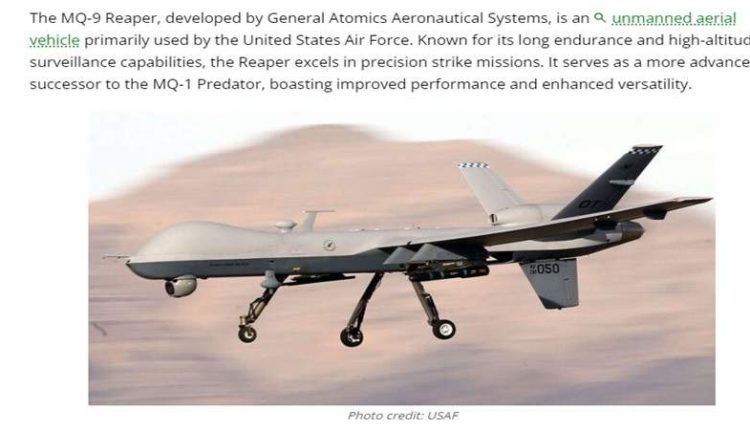 وذكر أن الطائرة أم كيو -9 التي طورتها شركة “جنرال اتوميكس لأنظمة الطيران” تعد طائرة جوية تستخدمها في المقام الأول القوات الجوية الأمريكية.. تمتاز بقدرتها الطويلة على التحمل وقدراتها على المراقبة على ارتفاعات عالية، وتتفوق في مهام الضربات الدقيقة.. وهي تعمل كخليفة أكثر تقدمًا لـ “أم كيو-1” حيث تمتاز بأداء محسن وتنوع معزز.. ومع ذلك تبلغ تكلفة طائرة “أم كيو-9” حوالي 16.9 مليون دولار.. يشمل هذا الرقم الطائرة نفسها، إلى جانب محطات التحكم الأرضية اللازمة والمعدات الداعمة الأخرى.. يمكن أن تكون التكلفة الإجمالية للبرنامج، والمحاسبة للبحث والتطوير والمشتريات، أعلى بكثير.