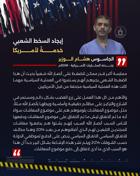 أورد الجاسوس ضمن شبكة التجسس الأمريكية الإسرائيلية هشام الوزير بعضاً من تفاصيل المؤامرة الأمريكية ضد “أنصار الله”.