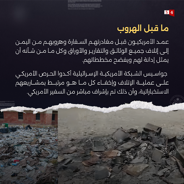 ويضيف الجاسوس الهمداني: “قبل مغادرة الأمريكيين السفارة الأمريكية تم إتلاف جميع التقارير والوثائق والأوراق في جميع مكاتبها بتوجيهات وإشراف مباشر من قبل السفير الأمريكي، وبعد الإتلاف اجتمع السفير بجميع الموظفين وإشعارهم بأنه سيتم إغلاق السفارة، وأنه سيتم التواصل بهم وأن رواتبهم، ستبقى مستمرة إلى إشعار آخر”.