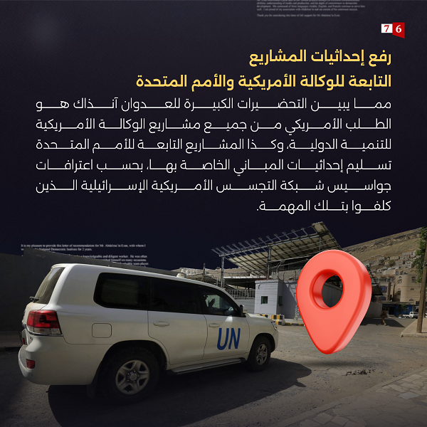 ويواصل الجاسوس الوزير في اعترافاته: “جزئية مهمة جداً أكدت لي أنا شخصياً أنه في تحضيرات كبيرة للعدوان، حيث طلب من جميع المشاريع التابعة للوكالة وجميع المشاريع التابعة للأمم المتحدة تسليم الإحداثيات الخاصة بالمباني لها في صنعاء، وقد طلب من الجميع تسليم الإحداثيات الخاصة بهم ورفع الإحداثيات الخاصة بهم عبر أخذها بواسطة الجي بي إس أو تحديدها على برنامج جوجل إرث ورفعها”، مشيراً إلى أنه وبجانبه الجاسوسين شايف الهمداني وعبد الحميد العجمي كلفوا بنفس المهمة وهي رفع الاحداثيات.