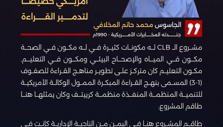 وجاء في اعترافات الجاسوس محمد المخلافي أن أمريكا أرسلت طاقم مخابراتي خصيصا لتدمير القراءة في اليمن عبر مشروع الـ CLB .