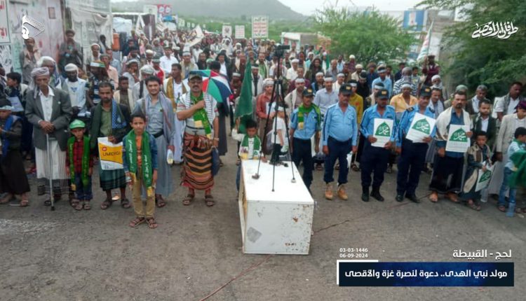 احتشد أبناء مديرية القبيطة في محافظة لحج اليوم، في مسيرة جماهيرية تحت شعار “مولد نبي الهدى.. دعوة لنصرة غزة والأقصى”، تضامناً مع الشعب الفلسطيني وتدشينا لذكرى المولد النبوي الشريف.