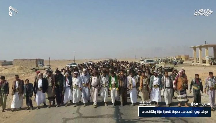 شهدت محافظة مأرب اليوم 11 مسيرة حاشدة تحت شعار “مولد نبي الهدى.. دعوة لنصرة غزة والأقصى” وفاءً لرسول الله، ونصرةً للشعب الفلسطيني.