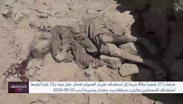 يوم 10 سبتمبر 2016م، استهدف طيران العدوان السعودي الأمريكي، عمال حفار مياه ومرفقاته في منطقة بيت سعدان بمديرية أرحب بصنعاء، ولاحق بغاراته المسعفين الذين هرعوا لإنقاذ الضحايا في جريمة حرب وإبادة مركبة بشعة، عن سابق إصرار وترصد، أظهرت حجم الوحشية التي يرتكبها العدوان بحق الشعب اليمني، وأسفرت عن 27 شهيداً مدنياً و80 جريحاً، وحالة خوف ورعب، وحزن لدى الأهالي وأضرار في الممتلكات المجاورة، ومشاهد مأساوية لم تمحَّ من الذاكرة الشعبية والرسمية لليمن.