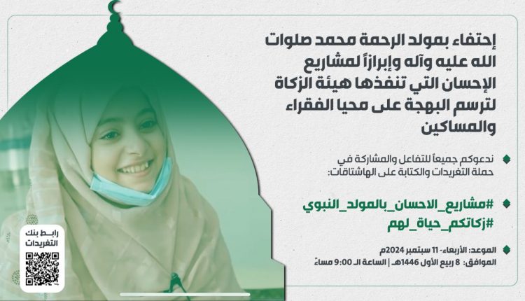 تنطلق مساء اليوم الأربعاء حملة تغريدات واسعة على منصة “إكس” تتويجاً لمشاريع الإحسان التي ستدشنها الهيئة العامة للزكاة صباح الأربعاء بمناسبة حلول ذكرى المولد النبوي الشريف