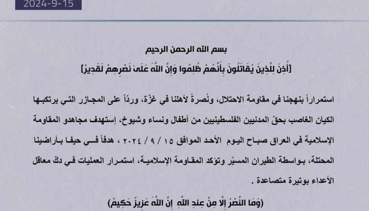 وقالت المقاومة العراقية في بيان لها: إنه “استمراراً بنهجنا في مقاومة الاحتلال، ونُصرةً لأهلنا في غزّة، وردّاً على المجازر التي يرتكبها الكيان الغاصب بحقّ المدنيين الفلسطينيين من أطفال ونساء وشيوخ، إستهدف مجاهدونا هدفاً حيوياً في حيفا المحتلة بواسطة الطيران المسيّر “.