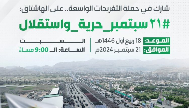 تنطلق تمام الساعة من مساء اليوم السبت, حملة تغريدات واسعة بمناسبة حلول الذكرى العاشرة لثورة 21 سبتمبر المجيدة,ثورة الحرية والاستقلال ورفض الوصاية والتبعية والارتهان.