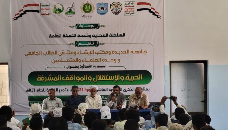 الحديدة- يمني برسنظمت جامعة الحديدة وملتقى الطالب الجامعي ووحدة العلماء والمتعلمين بمحافظة الحديدة، اليوم ندوة بعنوان “الحرية والاستقلال والمواقف المشرفة” في إطار الاحتفال بالعيد العاشر لثورة 21 سبتمبر.