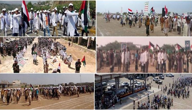 وهتف المشاركون في العرض، الذي شهدته مديرية نجرة بالمحافظة، بشعارات النصرة للشعب الفلسطيني المظلوم والجاهزية لدعم المجاهدين والمقاومة الباسلة.