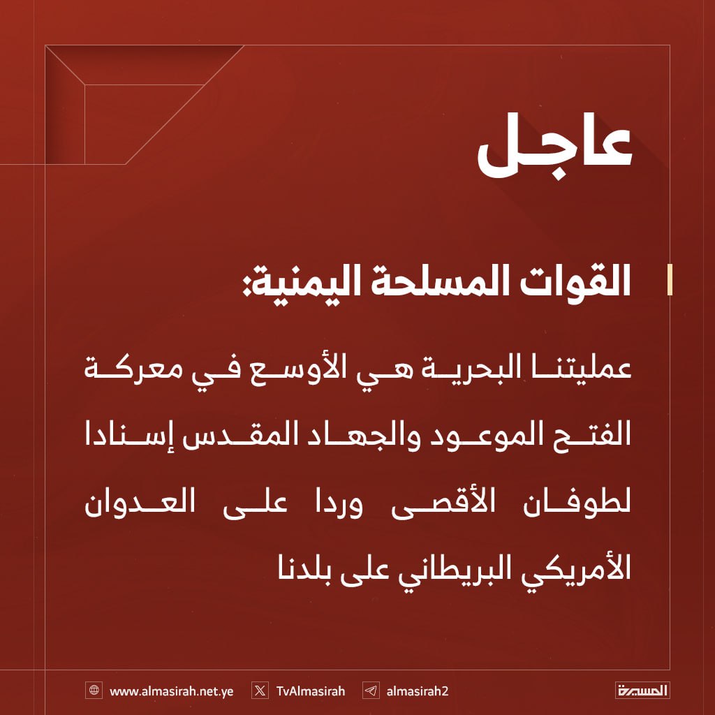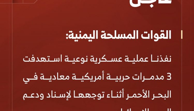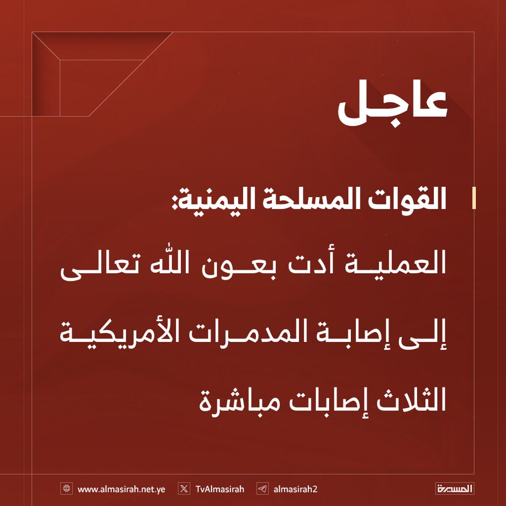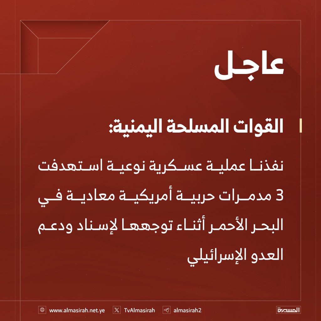 شاهد| بيان القوات المسلحة اليمنية بشأن تنفيذ عملية عسكرية نوعية استهدفت 3 مدمرات حربية أمريكية معادية في البحر الأحمر (إنفوجرافيك)