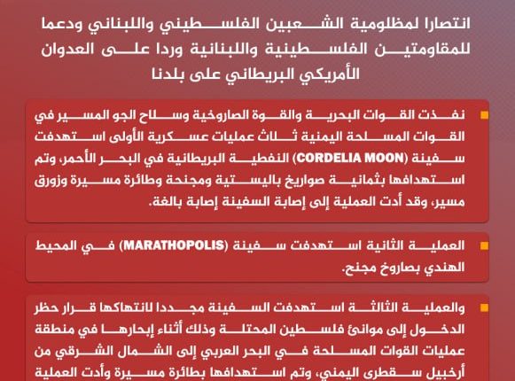 بيان القوات المسلحة اليمنية بشأن تنفيذ 3 عمليات عسكرية في إطار فرض الحصار البحري على العدو الإسرائيلي وردا على العدوان الأمريكي البريطاني 28-03-1446 | 01-10-2024