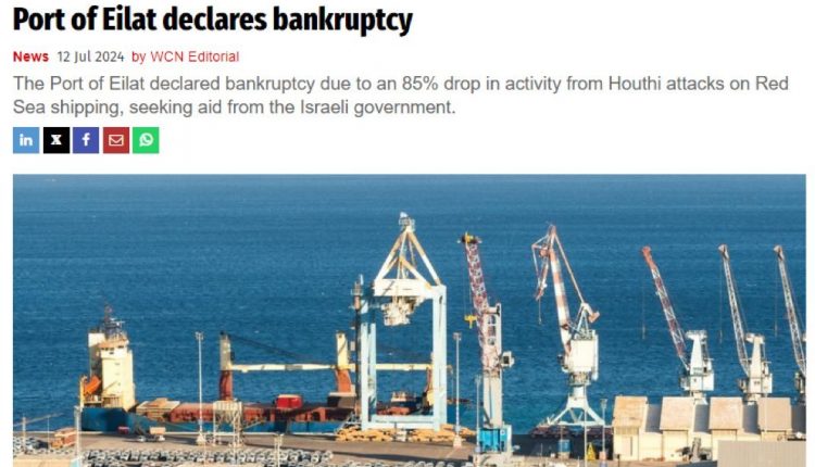 أكد موقع “World Cargo News”، إعلان ميناء إيلات التابع للكيان الصهيوني، رسمياً إفلاسه بسبب انخفاض نشاطه بنسبة 85٪ جراء هجمات الجيش اليمني على السفن الإسرائيلية والمرتبطة بكيان العدو منذ دخول اليمن في معركة طوفان غزة إسنادا للمقاومة الفلسطينية.