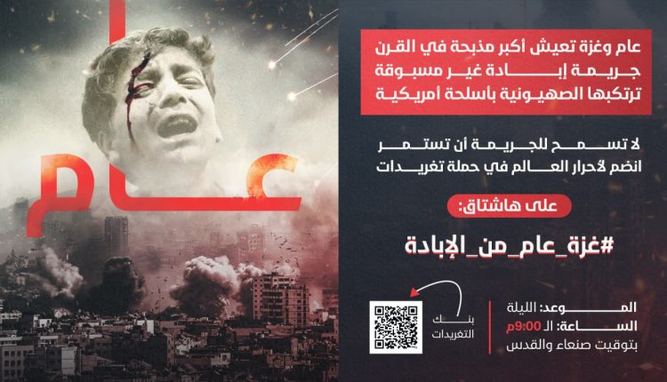 تنطلق تمام التاسعة من مساء اليوم السبت, بتوقيت العاصمة صنعاء والقدس’ حملة تغريدات واسعة على مواقع التواصل الاجتماعي لإبراز جرائم الإبادة الغير مسبوقة التي يتعرض لها أبناء غزة خلال عام منذ بد العدوان الأمريكي الصهيوني على القطاع.