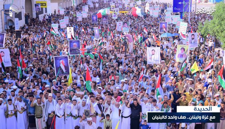 اكتظت 78 ساحة بمحافظة الحديدة، عصر اليوم الجمعة، بحشود مليونية في مركز ومديريات المحافظة تحت شعار، “مع غزة ولبنان صف واحد كالبنيان”.