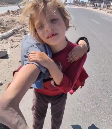 مشهد مؤلم للغاية لطفلة تحمل شقيقتها المصابة لإنقاذها بعد فقدانهما عائلتهما في غزة “فيديو”