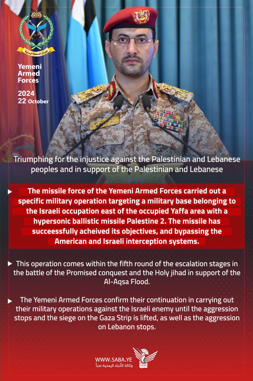انفو… بيان القوات المسلحة اليمنية بشأن استهداف قاعدة عسكرية إسرائيلية بصاروخ باليستي فرط صوتي