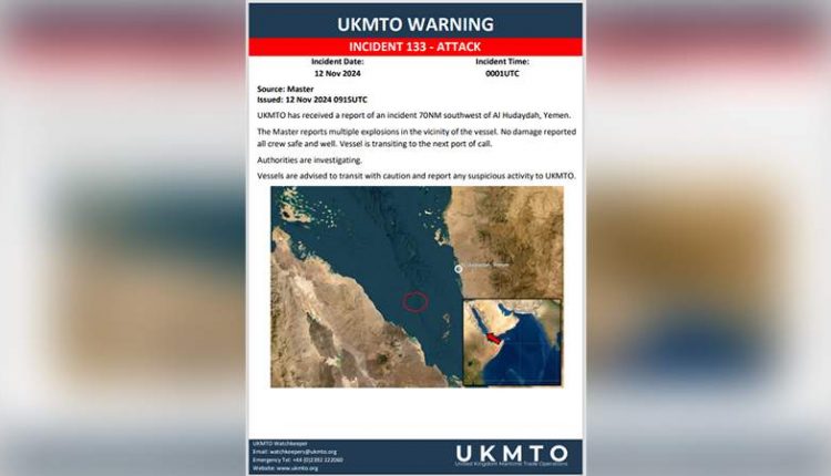 وبحسب بيان مقتضب نشرته الهيئة على صفحتها عبر منصة (إكس) فقد “أبلغ القبطان عن وقوع انفجارات متعددة في محيط السفينة، ولم ترد أنباء عن وقوع أضرار، وجميع أفراد الطاقم بخير وسالمون، وتتجه السفينة إلى ميناء الرسو التالي” حد زعمها.
