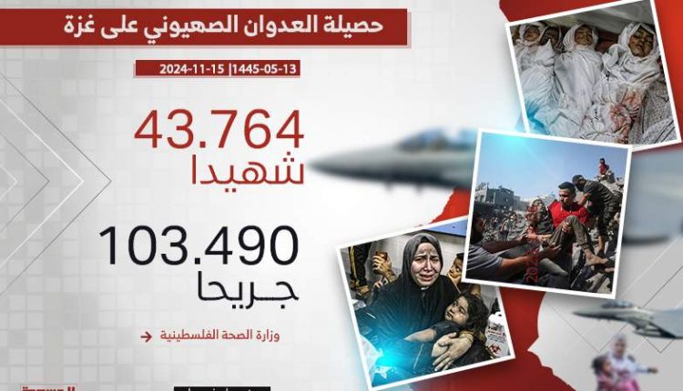 وفي التقرير الاحصائي اليومي لعدد الشهداء والجرحى جراء العدوان الإسرائيلي المستمر لليوم ال 406 على قطاع غزة، أفادت الوزارة بارتفاع حصيلة العدوان الإسرائيلي إلى 43,764 شهيد و 103,490 إصابة منذ السابع من أكتوبر للعام 2023م.