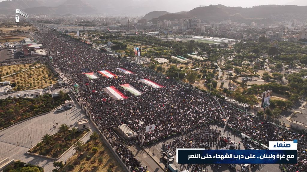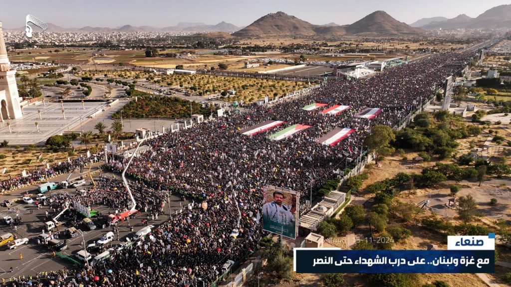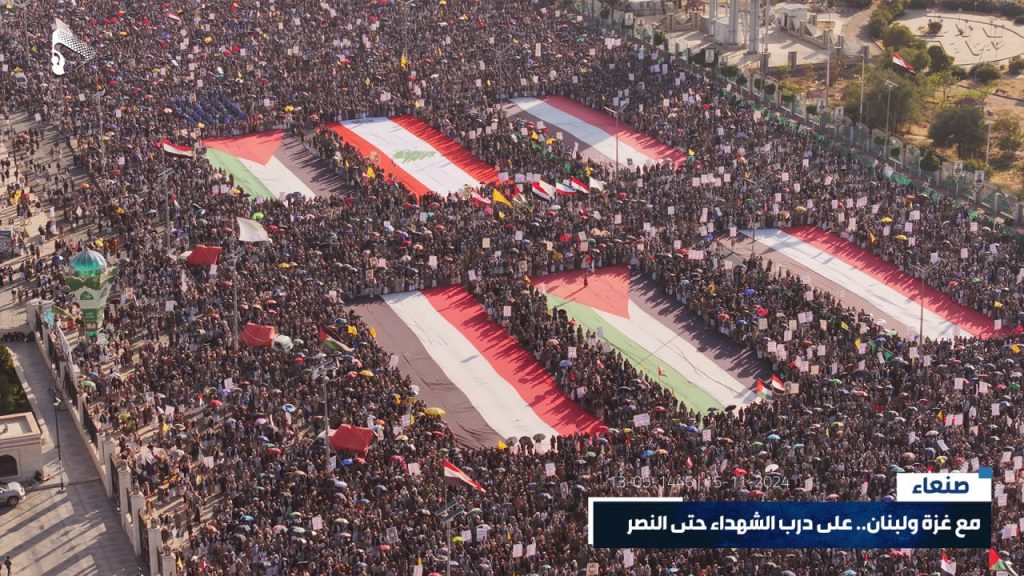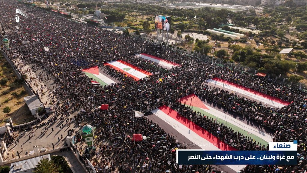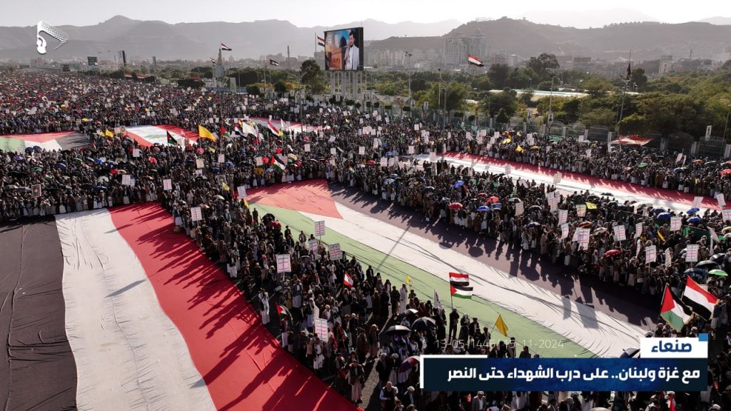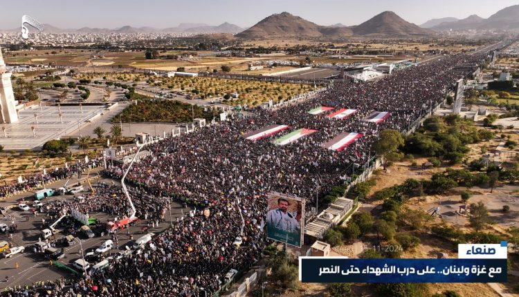 حشود مليونية في ميدان السبعين بالعاصمة صنعاء في مسيرة “مع غزة ولبنان.. على درب الشهداء حتى النصر”