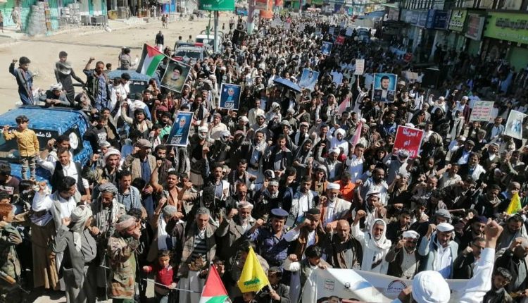 ورفعت الحشود أعلام اليمن وفلسطين ولبنان، مرددة الهتافات المؤكدة على وقوف اليمن إلى جانب الشعبين الفلسطيني واللبناني ضد العدو الصهيوني.