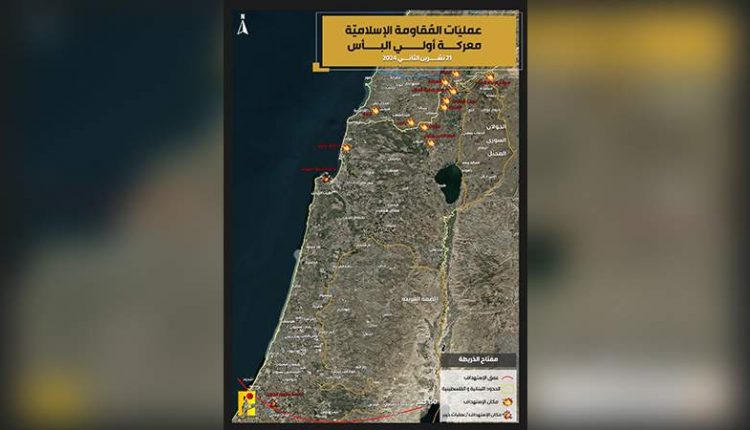 1- الساعة 16:00 من مساء الأربعاء 20-11-2024 شن هجوم جوي بسربٍ من المُسيّرات الانقضاضيّة على تجمعٍ لقوات جيش العدو الإسرائيلي في مستوطنة كريات شمونة، وأصابت أهدافها بدقّة.