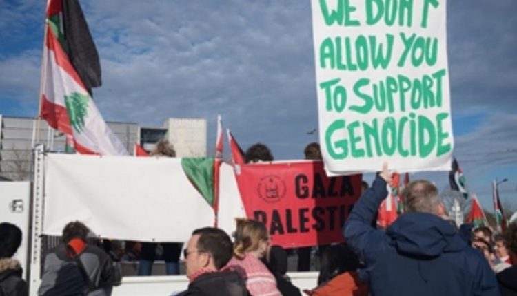 وحمل المتظاهرون الأعلام الفلسطينية واللبنانية، ولافتات باللغات الفرنسية والإنجليزية والألمانية مكتوب عليها: “لا نسمح لكم بدعم الإبادة الجماعية” و”أوقفوا الإبادة الجماعية” و”لا أسلحة للإبادة الجماعية”.