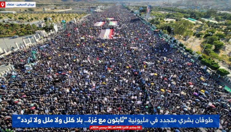 حشود مليونية غفيرة بالعاصمة صنعاء تأكيداً على استمرار جبهة المساندة والدعم لغزة