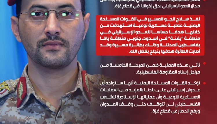 بيان القوات المسلحة اليمنية بشأن استهداف هدفاً حساساً للعدو الإسرائيلي في منطقة “يفنة” في أسدود، جنوبي منطقة #يافا بـ #فلسطين المحتلة