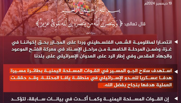 انفوجرافيك ـ بيان القوات المسلحة اليمنية بشأن استهداف هدفا عسكريا للعدو الإسرائيلي في يافا المحتلة بطائرة مسيرة انفوجرافيك ـ بيان القوات المسلحة اليمنية بشأن استهداف هدفا عسكريا للعدو الإسرائيلي في يافا المحتلة بطائرة مسيرة On ديسمبر 19, 2024 Share يمني برس ـ انفوجرافيك Share