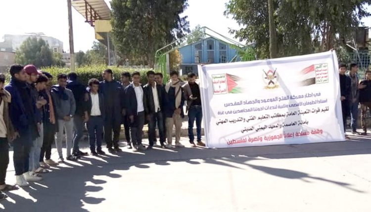 نظم قطاع التعليم الفني والتدريب المهني في أمانة العاصمة ومعهدي اليمني الصيني وعبد الناصر التجاري،اليوم الاثنين، وقفة اعلاناً للجهوزية لمواجهة العدوان ونصرة للشعب الفلسطيني.