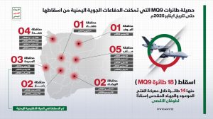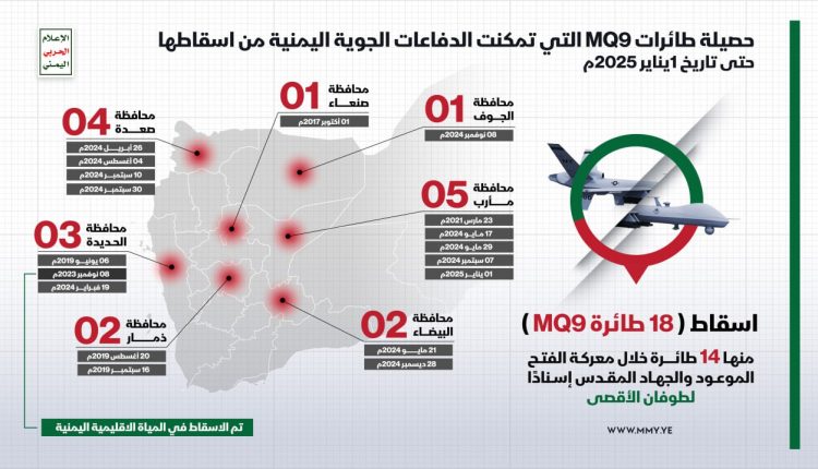 انفوجرافيك – حصيلة طائرات MQ9 الأمريكية التي تمكنت الدفاعات الجوية اليمنية من اسقاطها (حتى 1 يناير 2025م) انفوجرافيك – حصيلة طائرات MQ9 الأمريكية التي تمكنت الدفاعات الجوية اليمنية من اسقاطها (حتى 1 يناير 2025م) On يناير 1, 2025 Share Share