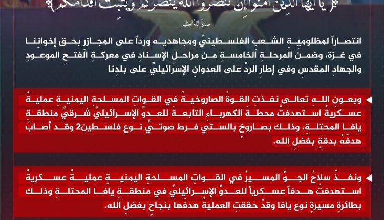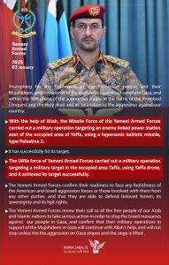 انفوجرافيك ـ بيان القوات المسلحة اليمنية بشأن استهداف “محطة كهرباء وهدف عسكري” في منطقة “يافا” المحتلة – 3 – يناير – 2025م انفوجرافيك ـ بيان القوات المسلحة اليمنية بشأن استهداف “محطة كهرباء وهدف عسكري” في منطقة “يافا” المحتلة – 3 – يناير – 2025م On يناير 3, 2025 Share Share