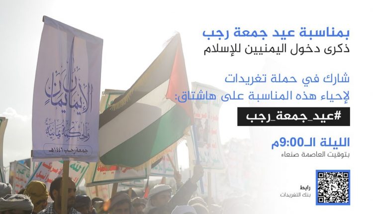 تنطلق حملة تغريدات الليلة الـ9:00م بتوقيت العاصمة صنعاء بمناسبة عيد جمعة رجب، ذكرى دخول اليمنيين للإسلام.