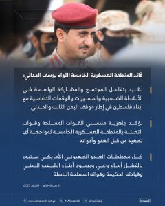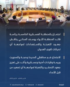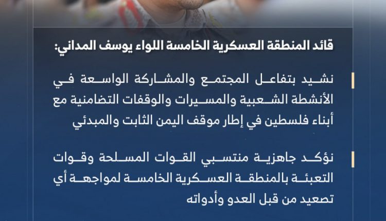 قائد المنطقة العسكرية الخامسة اللواء يوسف المداني: نؤكد جاهزية منتسبي القوات المسلحة وقوات التعبئة بالمنطقة العسكرية الخامسة لمواجهة أي تصعيد من قبل العدو وأدواته