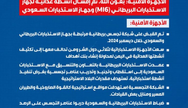 بيان تفاصيل واعترافات عناصر شبكة التجسس لجهازي الاستخبارات البريطاني والسعودي