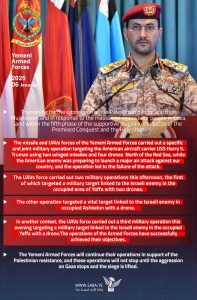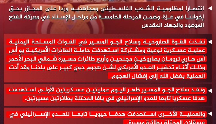 انفوجرافيك ـ بيان القوات المسلحة اليمنية بشأن استهداف حاملة الطائرات الأمريكية (ترومان) شمالي البحر الأحمر، وتنفيذ ثلاث عمليات عسكرية ضد أهداف في يافا وعسقلان المحتلتين 06-07-1446هـ 06-01-2025م