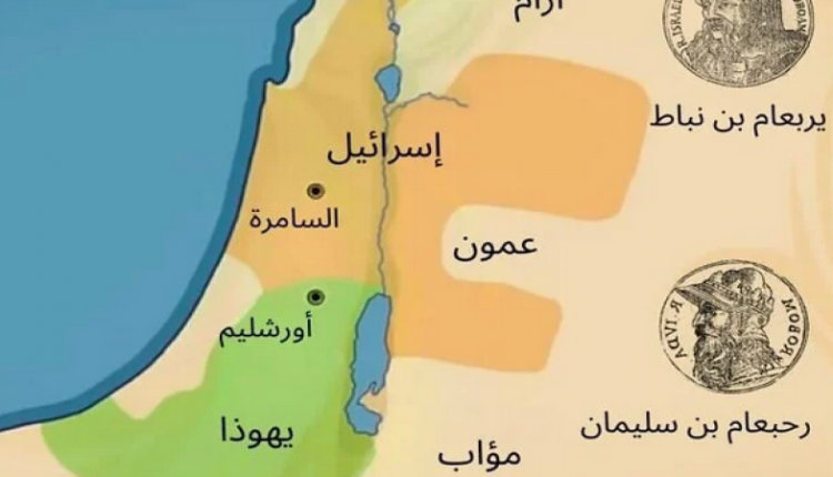 الخريطة تُشير إلى ما تزعُمُ أنه حدود المملكتين التاريخيتين لـ “إسرائيل ويهوذا” في عام 928 قبل الميلاد، وتشمل أجزاء من الأراضي الفلسطينية المحتلّة بالإضافة إلى الأردن ولبنان وسورية.