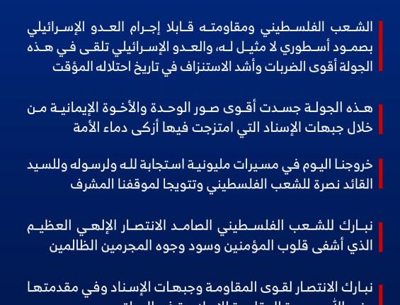 🟦 بيان مسيرات (مع غزة.. ثبات وانتصار) | 17 رجب 1446هـ 17 يناير 2025م بيان مسيرات (مع غزة.. ثبات وانتصار) | 17 رجب 1446هـ 17 يناير 2025م On يناير 17, 2025 Share Share
