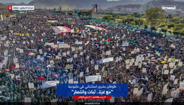 المسيرة نت: على مدى 15 شهرا متوالية لم يكل الشعب اليمني ولم يمل عن خروجه المليوني وتواجده في الساحات بصورة متصاعدة ومتزايدة، وفاء وثباتا وتضامنا وإسنادا ونصرة للشعب الفلسطيني، الذي يتعرض لحرب إبادة صهيونية في ظل صمت دولي.