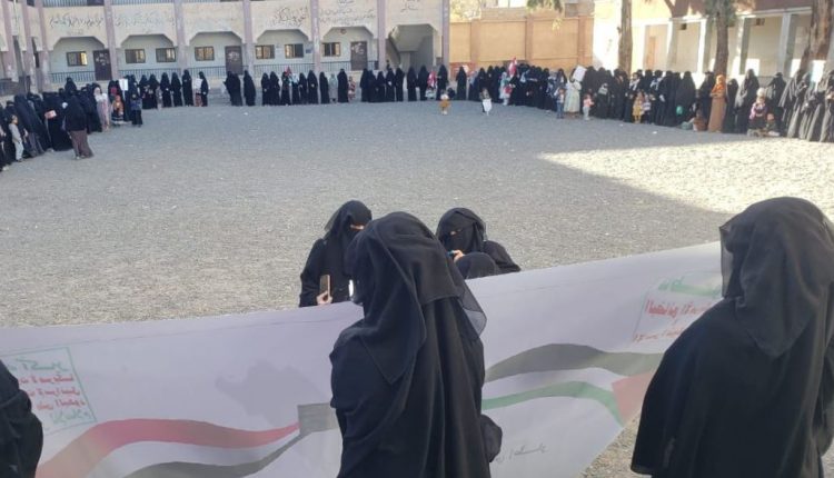 نظمت الهيئة النسائية الثقافية العامة بمحافظة عمران، اليوم ، وقفة للخريجات النسائية ، تضامنا مع غزه، تحت شعار “مع غزة جهادنا متصاعد حتى يتوقف العدوان ويرفع الحصار”.