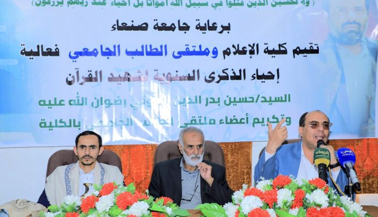 نظمت كلية الإعلام بجامعة صنعاء اليوم الأثنين ، فعالية خطابية وثقافية إحياء للذكرى السنوية للشهيد القائد حسين بدرالدين الحوثي.