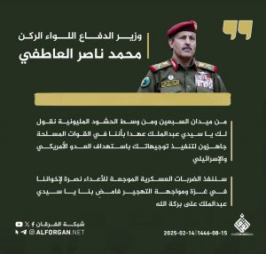 انفوجرافيك ـ وزير الدفاع اللواء الركن محمد ناصر العاطفي: من ميدان السبعين ومن وسط الحشود المليونية نقول لك يا سيدي عبدالملك عهدا بأننا في القوات المسلحة جاهزون لتنفيذ توجيهاتك باستهداف العدو الأمريكي والإسرائيلي