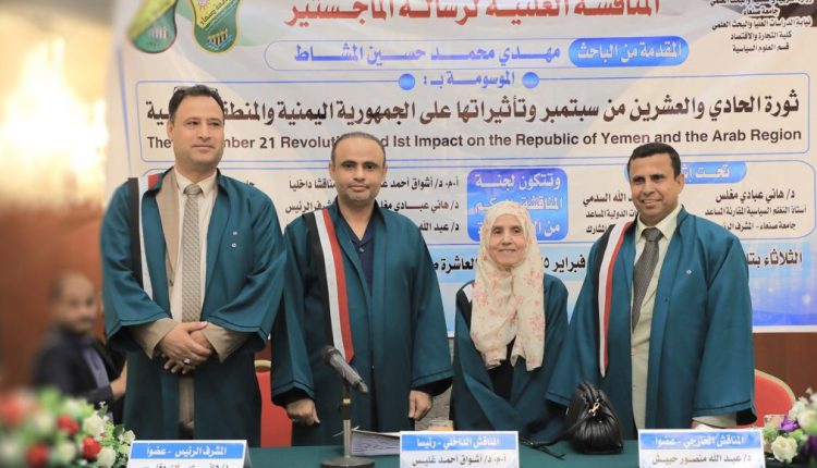حصل الباحث مهدي محمد حسين المشاط اليوم الثلاثاء، على درجة الماجستير بامتياز مع مرتبة الشرف في العلوم السياسية تخصص نظم سياسية، من كلية التجارة والاقتصاد بجامعة صنعاء عن رسالته الموسومة بـ “ثورة 21 سبتمبر وتأثيراتها على الجمهورية اليمنية والمنطقة العربية”.
