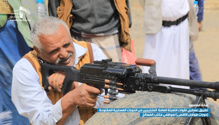 شاهد | تطبيق عسكري لقوات التعبئة العامة المتخرجين من الدورات العسكرية المفتوحة “دورات طوفان الأقصى” من موظفي مكتب المسالخ بأمانة العاصمة صنعاء 26-08-1446 | 24-02-2025