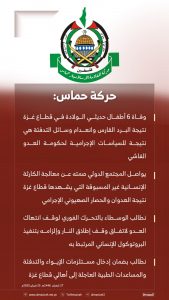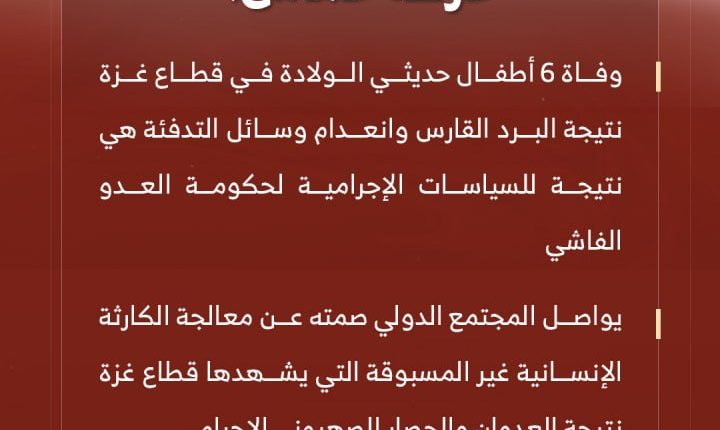 انفوجرافيك ـ حركة حماس: وفاة 6 أطفال حديثي الولادة في قطاع غزة نتيجة البرد القارس وانعدام وسائل التدفئة هي نتيجة للسياسات الإجرامية لحكومة العدو الفاشي