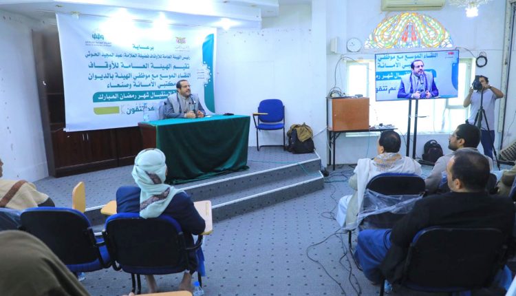 عقد بالهيئة العامة للأوقاف اليوم، لقاء موسع برئاسة رئيس الهيئة العلامة عبدالمجيد الحوثي في إطار الاستعدادات لاستقبال شهر رمضان والتهيئة لبرامج الشهر الفضيل تحت شعار “لعلكم تتقون”.