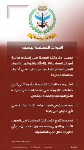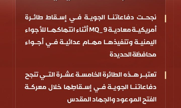 انفوجرافيك ـ بيان القوات المسلحة اليمنيةبشأن إسقاط طائرة أمريكية معادية MQ_9 أثناء انتهاكها للأجواء اليمنية وتنفيذها مهام عدائية في أجواء محافظة الحديدة