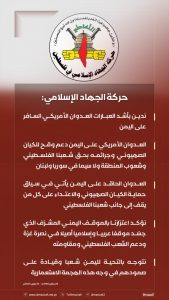 حركة الجهاد الإسلامي:العدوان الأمريكي على اليمن دعم وقح للكيان الصهيوني وجرائمه بحق شعبنا الفلسطيني وشعوب المنطقة ولا سيما في سوريا ولبنان
